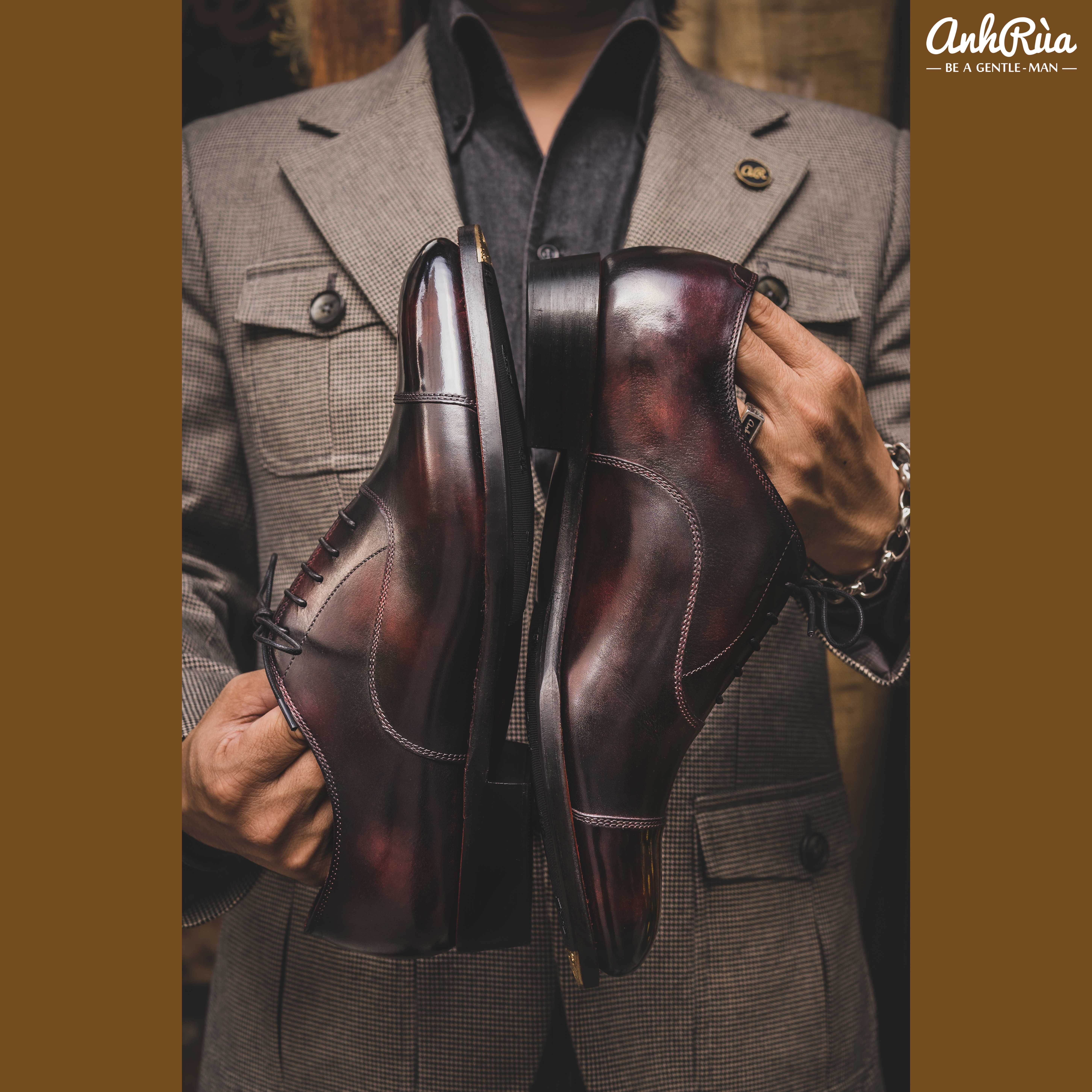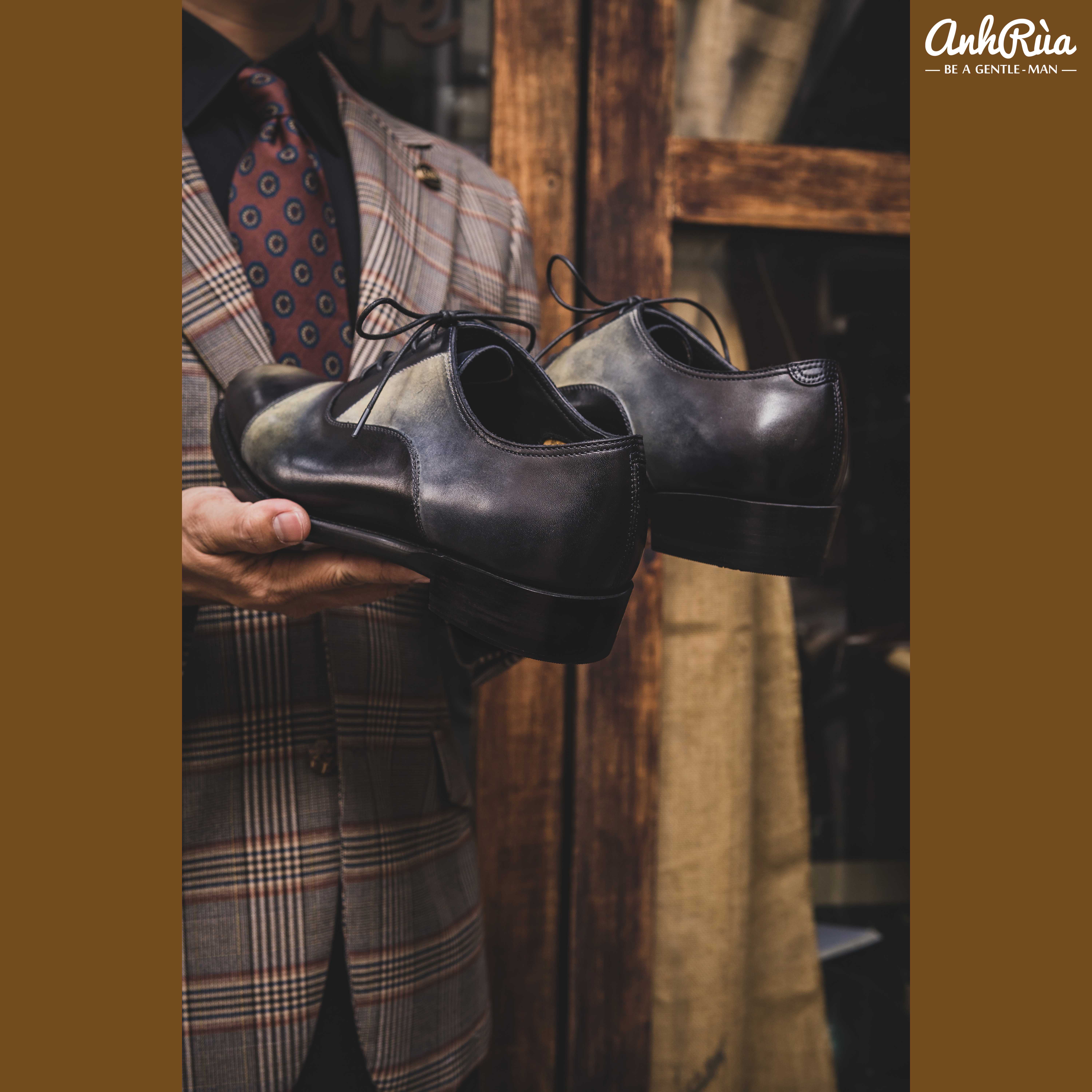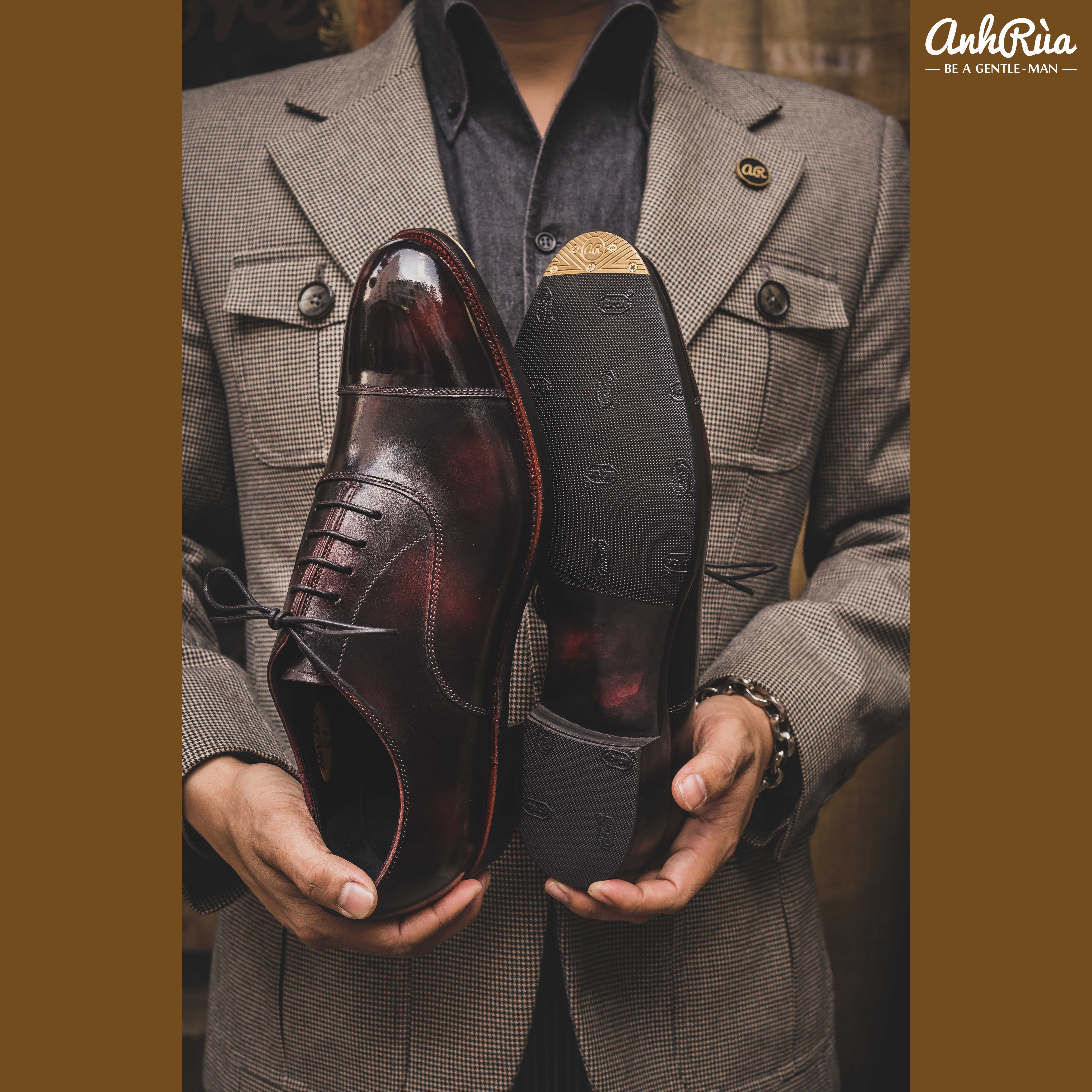 - Da mặt (upper): Da bê Ý (Italian calfskin) - nổi tiếng với độ mịn, độ dẻo và khả năng lên màu Patina xuất sắc. Đây là nền tảng để tạo nên một đôi giày vừa sang vừa có chiều sâu thẩm mỹ.